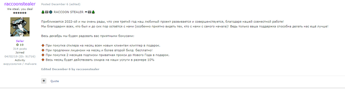 New Year’s, which is widely celebrated in CSU countries, is also popular in Russian-speaking forums. For instance, on December 6, 2021, the user RaccoonStealer, the ‘official’ distributor of the “Raccoon Stealer” information stealer, offered the malware for rent for a 10% discount to celebrate the New Year. The malware was offered on both Exploit and XSS, the most high profile Russian-speaking cybercrime forums. The user also stated that every new customer renting the stealer for a month will receive a clipper as a gift and that every user who rents the malware for two months will receive a private proxy until New Year’s. As expected, a surge of ‘interested’ comments appeared following the offer, asking the seller for the price, and inquiring about any updates to the malware.